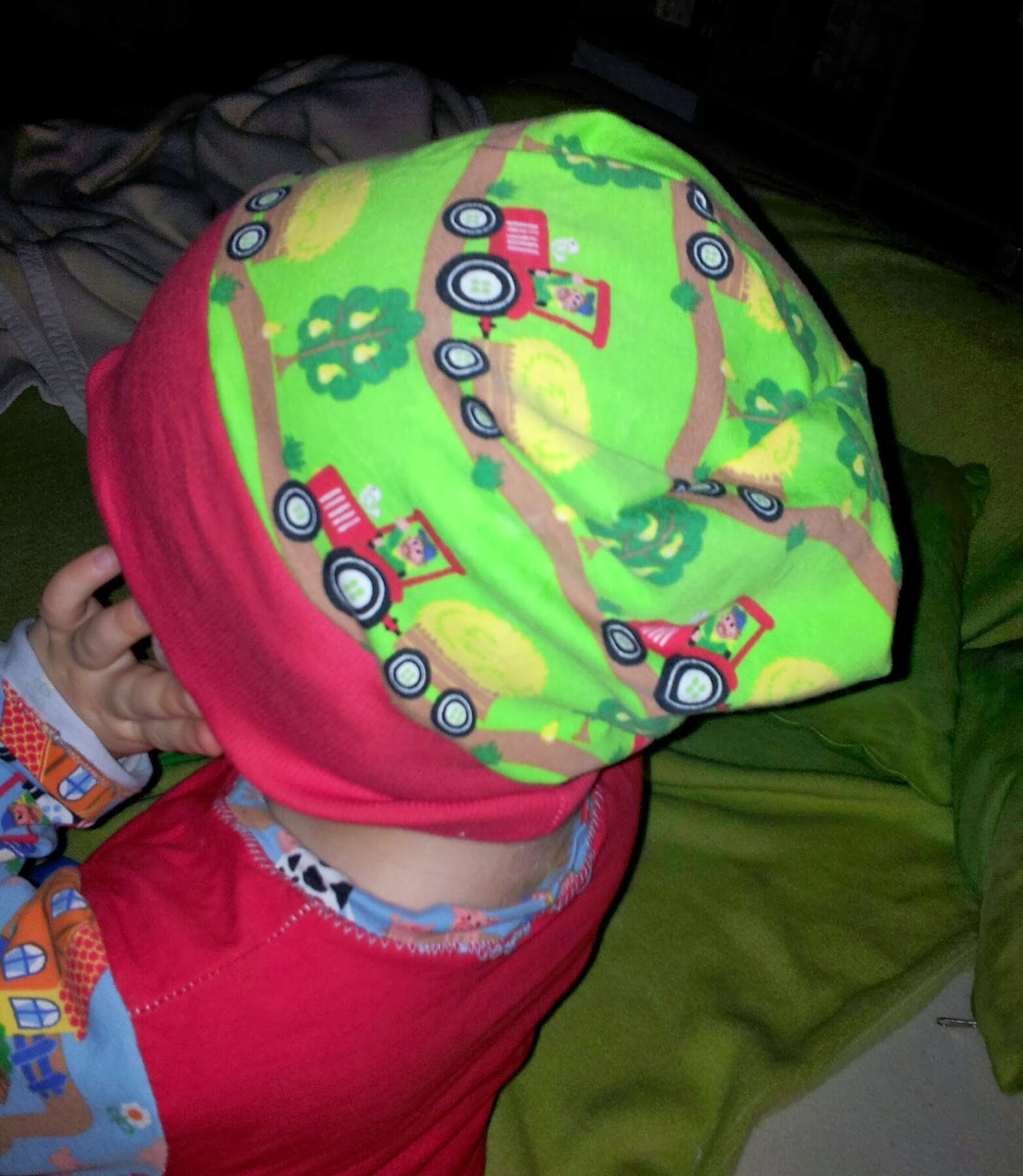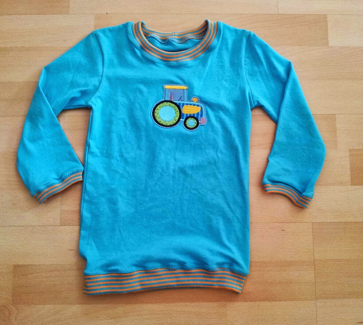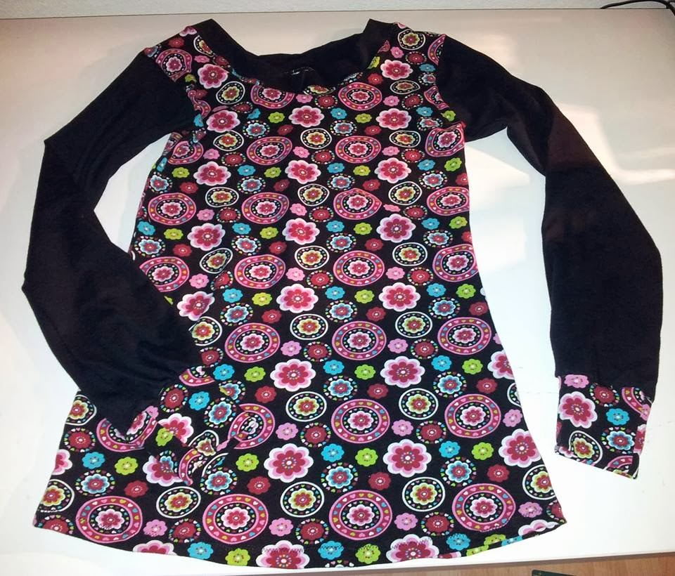 Die hat mich etwas Nerven gekostet, da ich hier noch am perfektionieren für mich bin (Halsausschnitt). Der Stoff war ein dünner Jersey aus einer Trigemalieferung. Zum Üben gerade richtig.